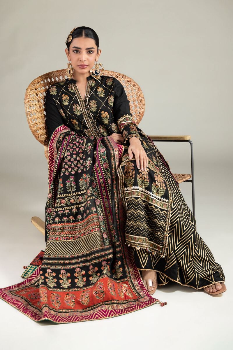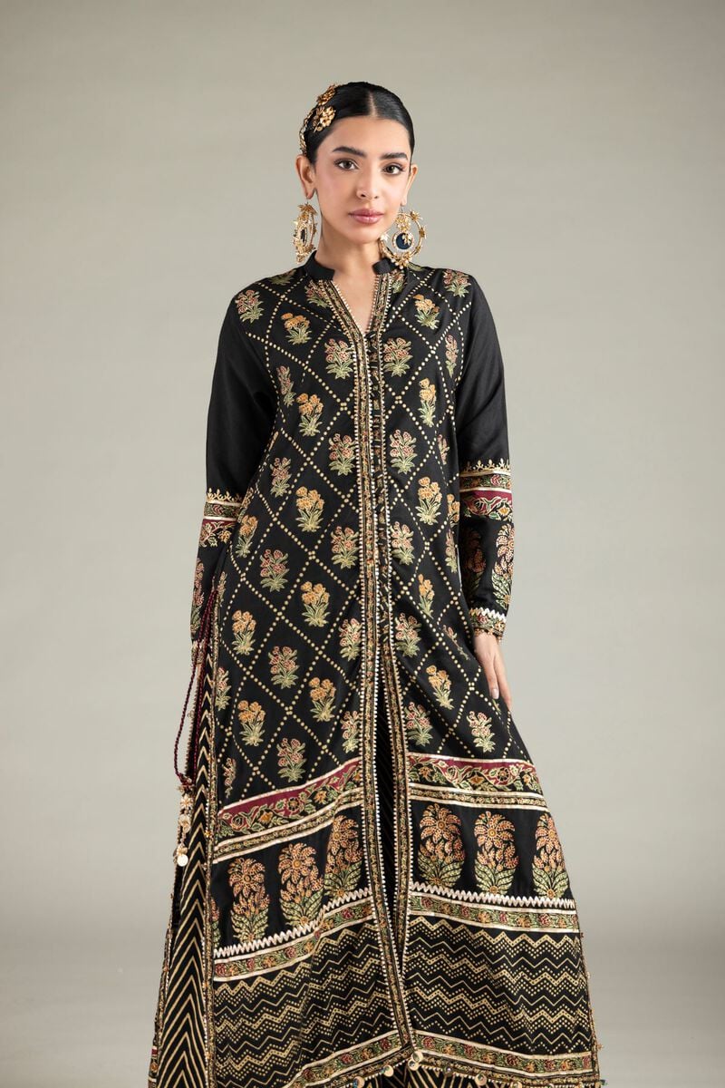 - Description: A 3-piece outfit featuring a floral printed front open long kurta, paired with a matching flared gharara.